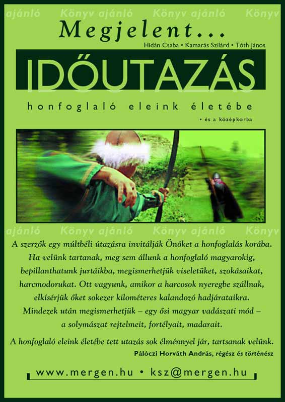 Előadásaink anyagából megjelent az "Időutazás honfoglaló eleink életébe és a középkorba" című kis könyvünk. Ebből a kiadványból köznapi nyelven ismerhetik meg gyermekek és felnőttek rajzok, fényképek segítségével a honfoglaló magyarok harcászatát, viseletét, fegyvereit valamint a solymászat titkait és a leggyakrabban használt madarakat. (A könyv ára: 500,- Ft + postaköltség) A mergen bt. ezenkívül a következő szolgáltatásokkal áll az Önök rendelkezésére: • tradicionális íjászfelszerelések árusítása (íj, nyíl, tarsoly, veretesöv, hajfonatkorongok, tarsolymintás kulcstartók, stb.) • Kazah és mongol típusú jurták készítése (Szöllősi Antal) • grafikai munkák - nyomdai előkészítés - újságszerkesztés • honlap készítés, karbantartás • papír kereskedelem: fénymásoló papírok - faxpapírok - leporellók - pénztárgépszalagok - thermo szalagok |